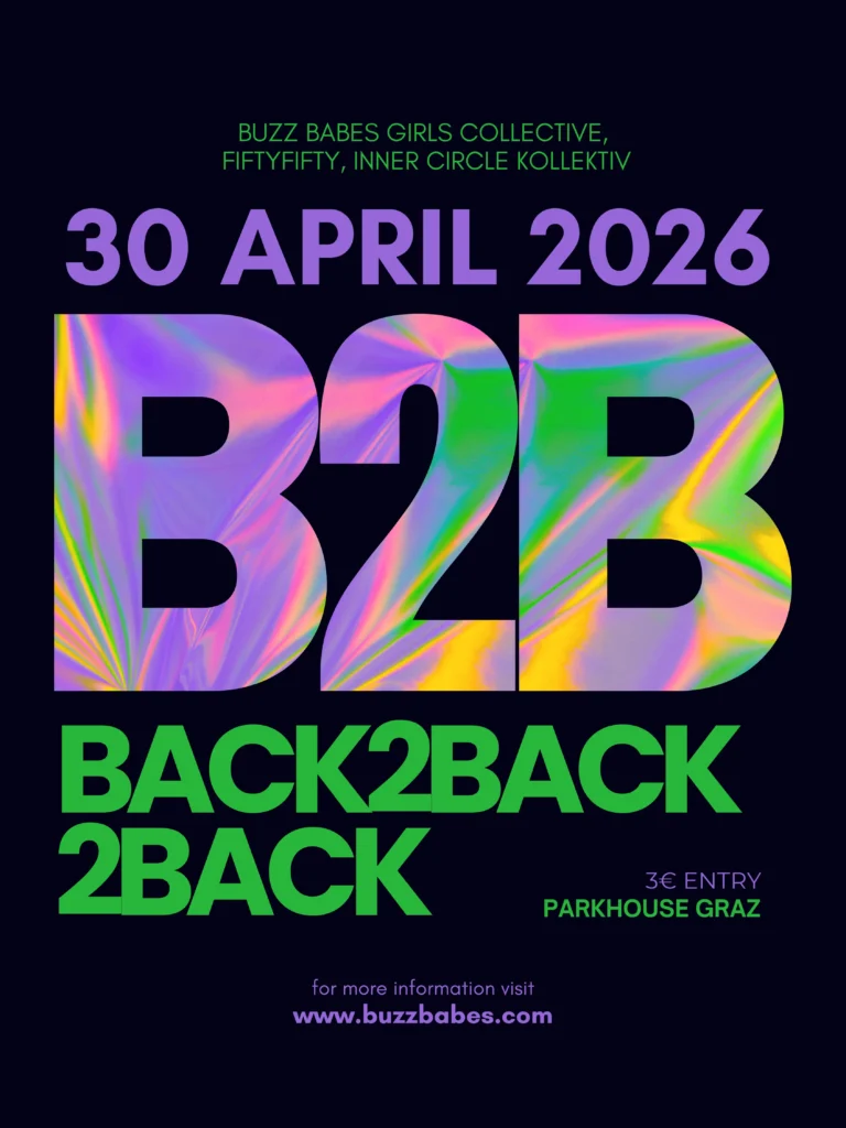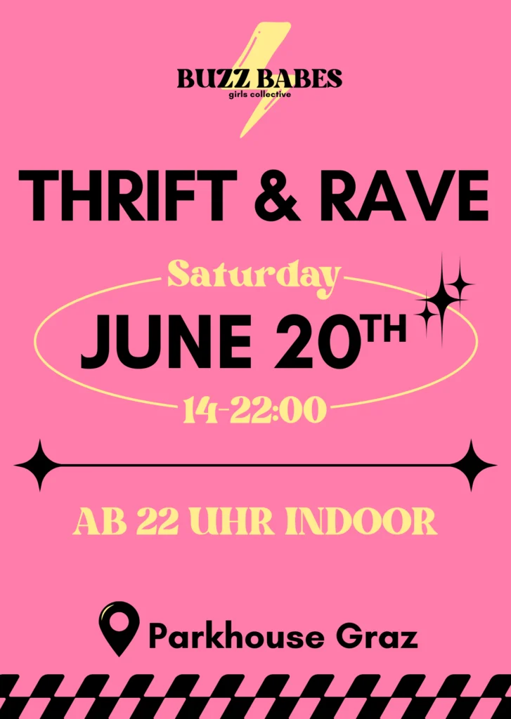 BUZZ BABES is a FLINTA* DJ collective from Graz, rooted in electronic music, rave culture and sustainable, flea market–inspired community energy.